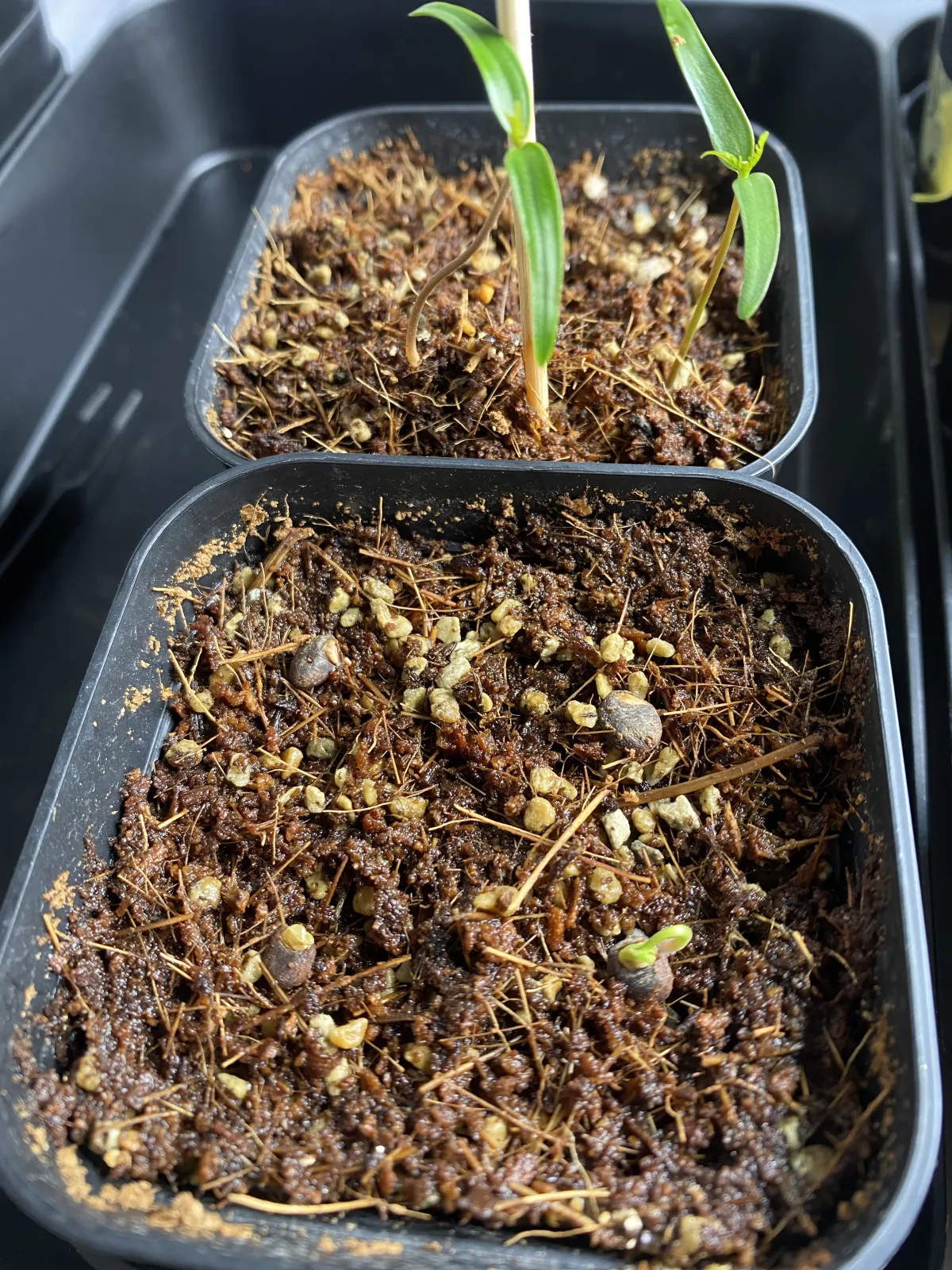 6粒発芽のうち、3つは根が伸びず葉っぱだけでしたが、前回の経験で本葉が出てきたので運が良ければ成長するかもしれないので、そのまま刺し芽?にしてあります。