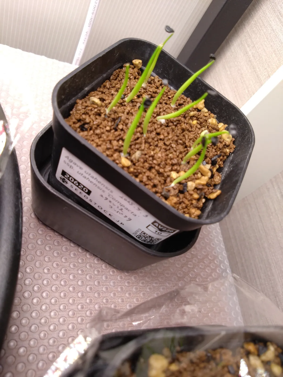 [ 播種日 ] 2025/4/25播種 [ 播種数 / 発芽数 ] 例: 10粒/ 10粒 播種前にベンレート溶液に1日程度浸漬 ひゅうが土メインの用土に1センチほど赤玉細粒を敷き播種、20度〜25度で管理 その後も、室内LEDパネルライトにて1日、5時間程度の照射ですが、順調に成長中。