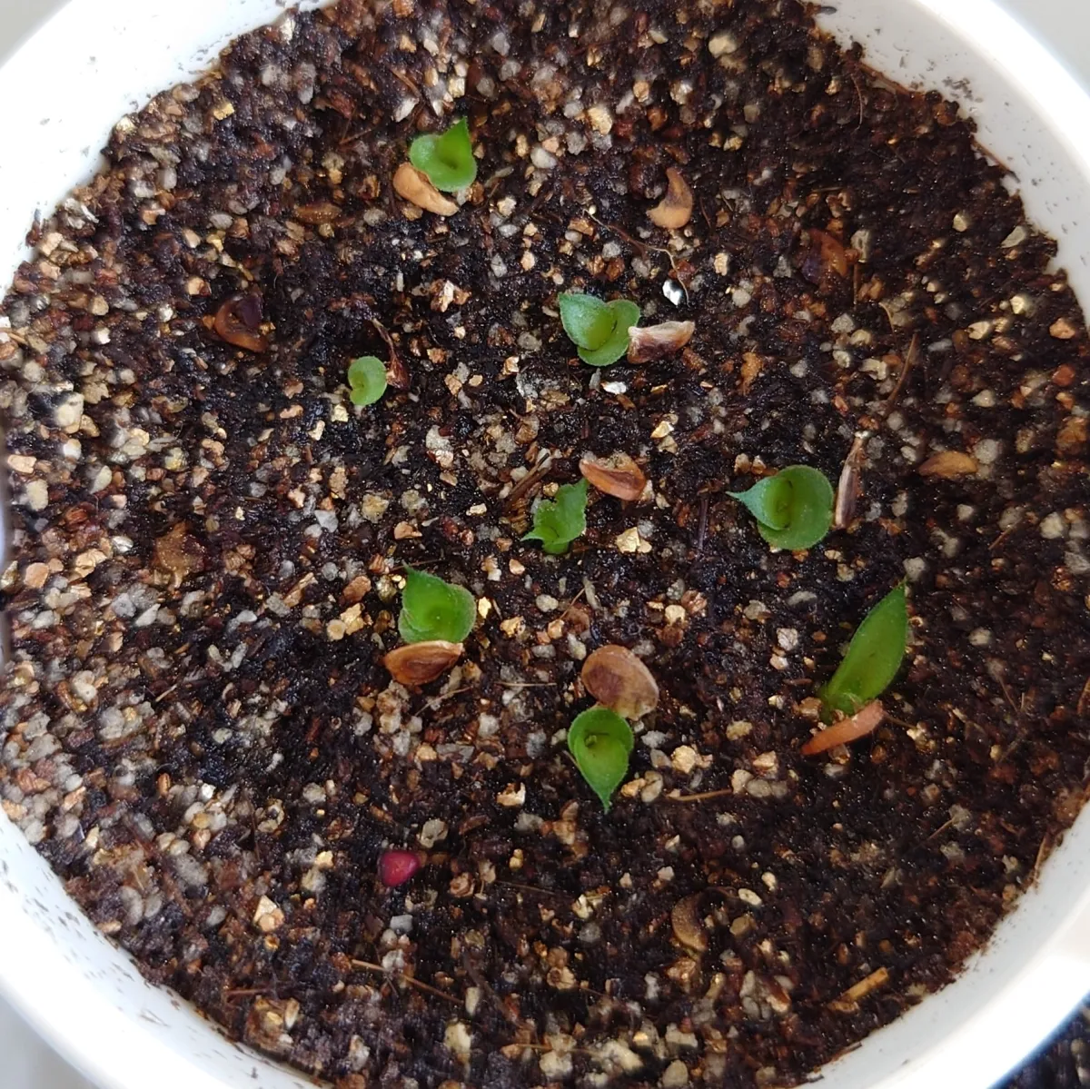 中心の茶色部分が大きい種は発芽したが、皮ばかりの種は発芽しなかった様子