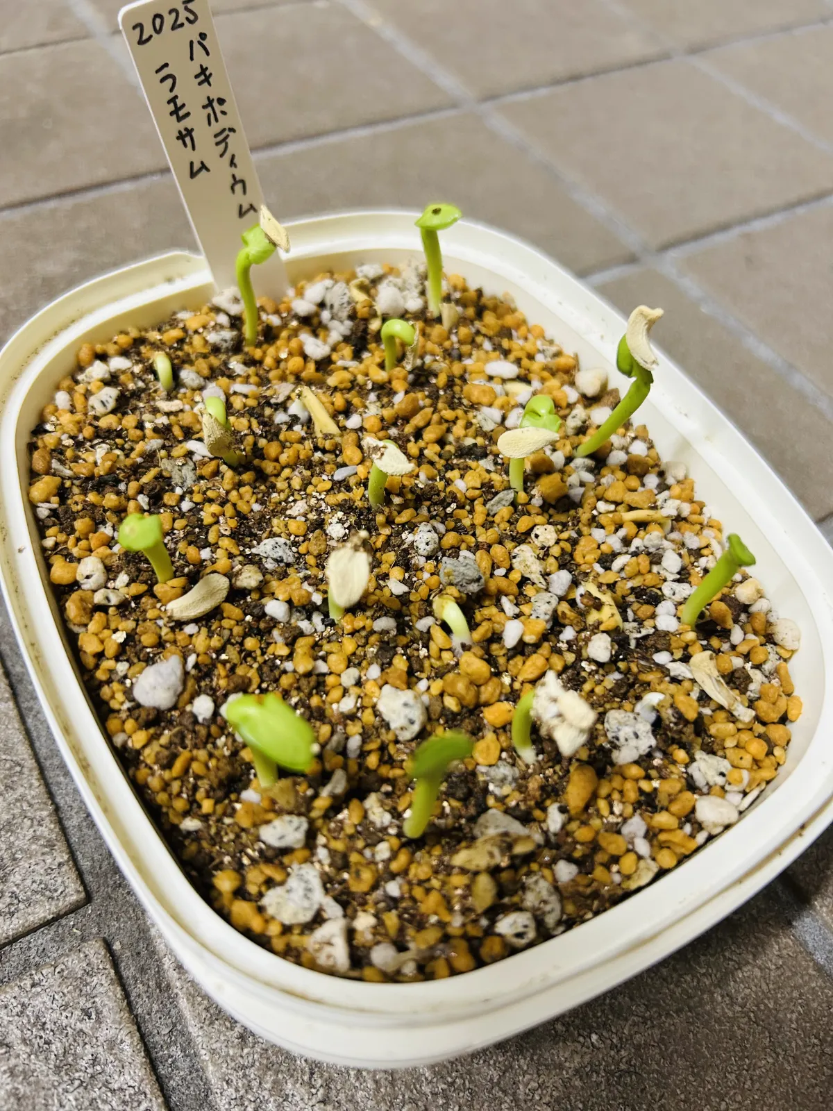 プラ容器で数個発芽を確認してから一般用土に播種