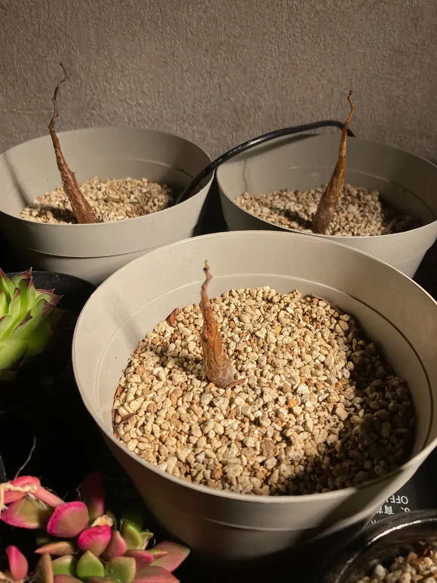 播種前に削って、ベンレート+メネデール溶液に半日程度 浸漬3粒は多肉用の土にバーミキュライトを敷き播種、腰水で日陰放置
