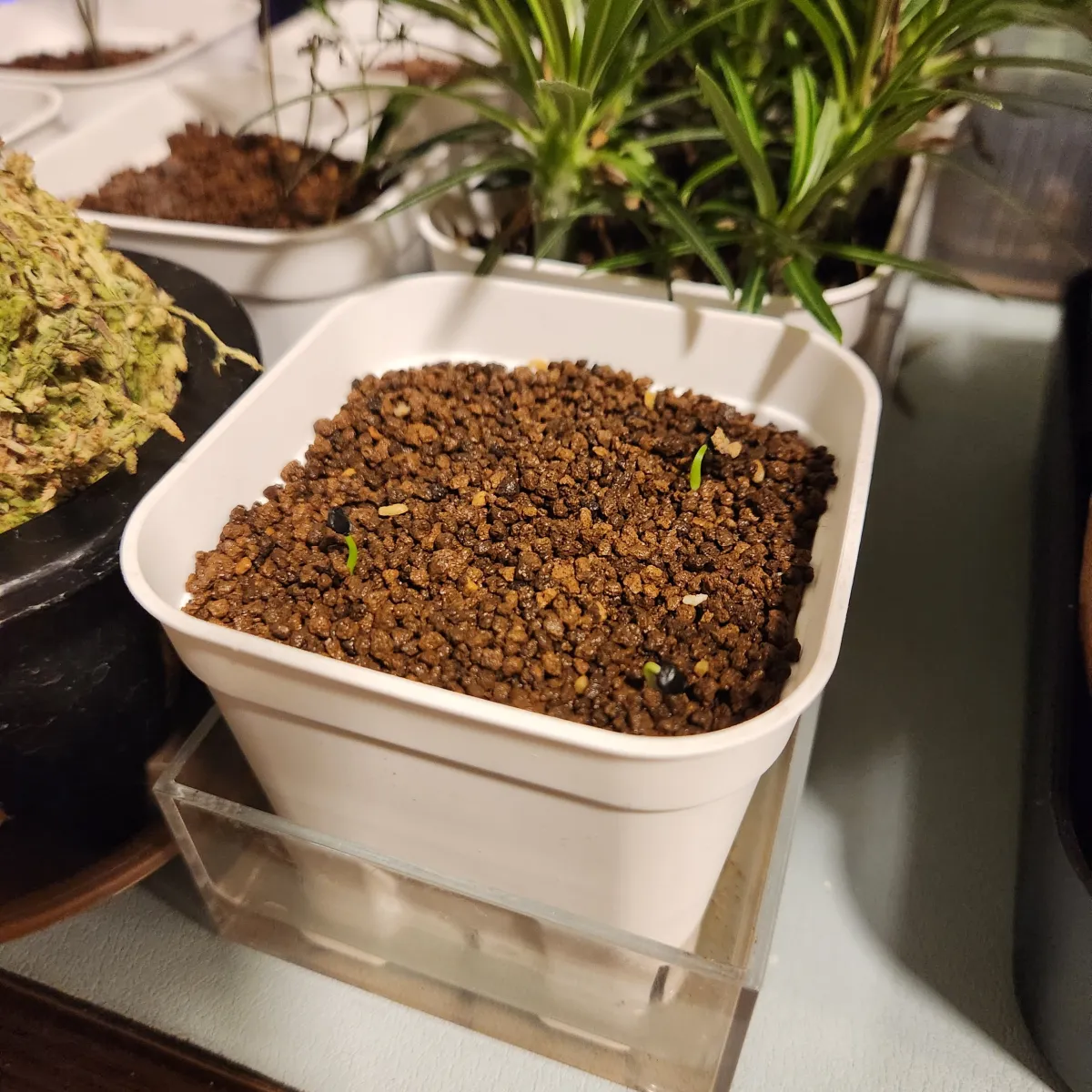 赤玉細粒2+鹿沼細粒1の用土に播種後うっすら赤玉細粒を被せメネデール+木酢希釈水で室内腰水管理
