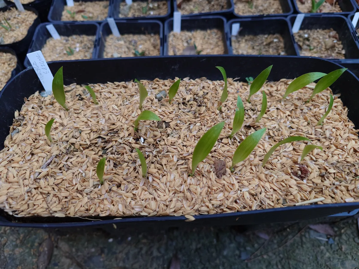・種は表土に垂直に刺し、籾殻を軽く撒いて覆う。