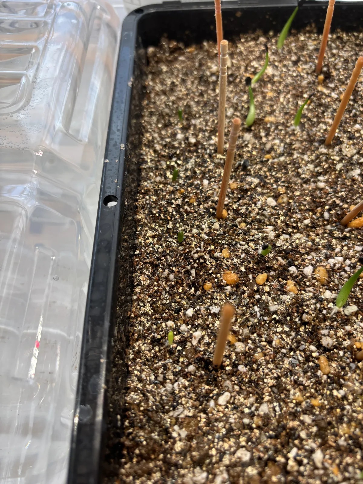 赤玉メインの用土に細目のバーミキュライトを敷き播種 その後は、蓋をして腰水管理。