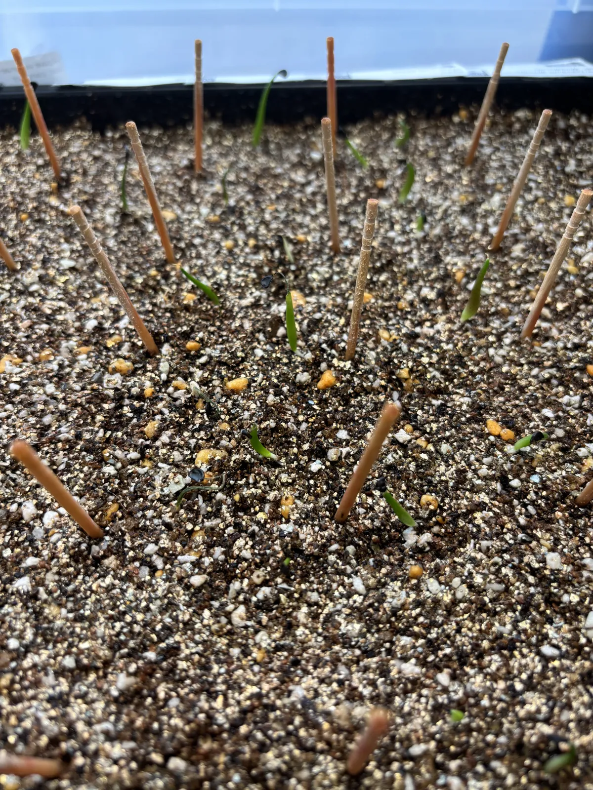 赤玉メインの用土に細目のバーミキュライトを敷き播種 その後は、蓋をして腰水管理。