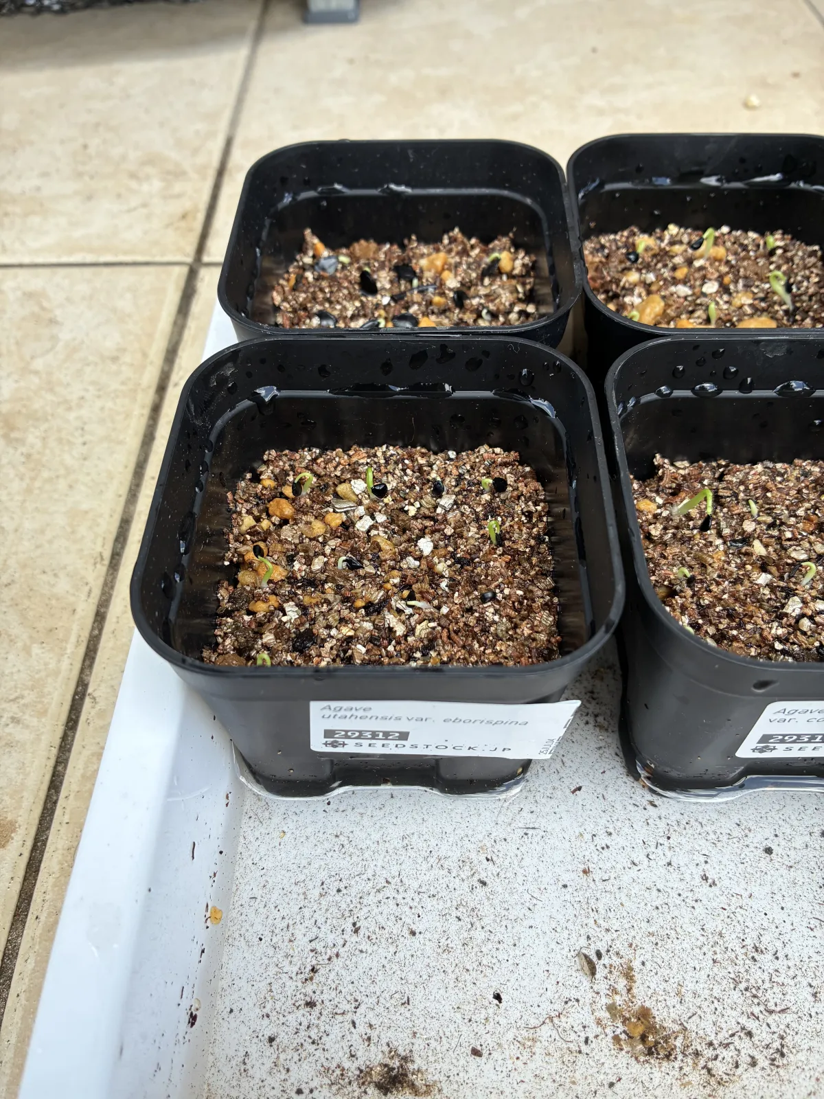 観葉植物用培養土:1+赤玉:1鹿沼土:1にバーミキュライトを敷き播種、遮光ネット内で腰水管理。