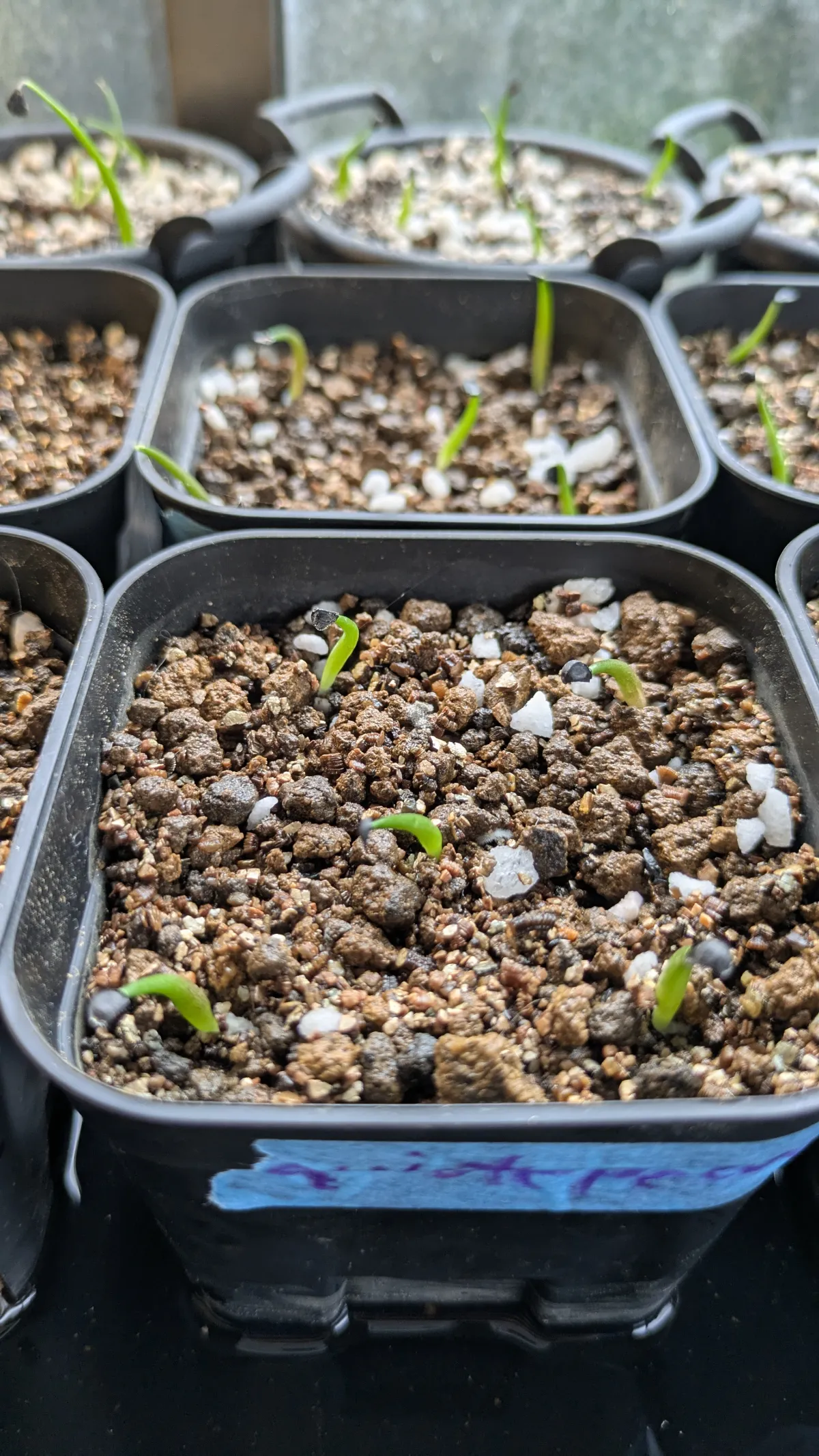 水に二晩つけてから赤玉メインの用土に播種、室内管理です。