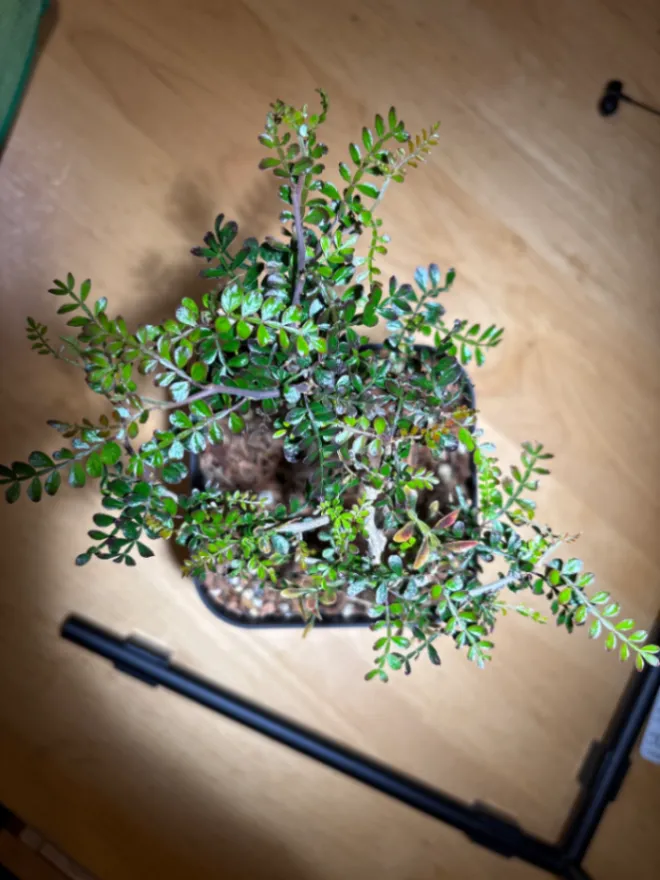 土はネコチップで管理。 暖かくなり、新たな枝が展開中。 順調に育っています。
