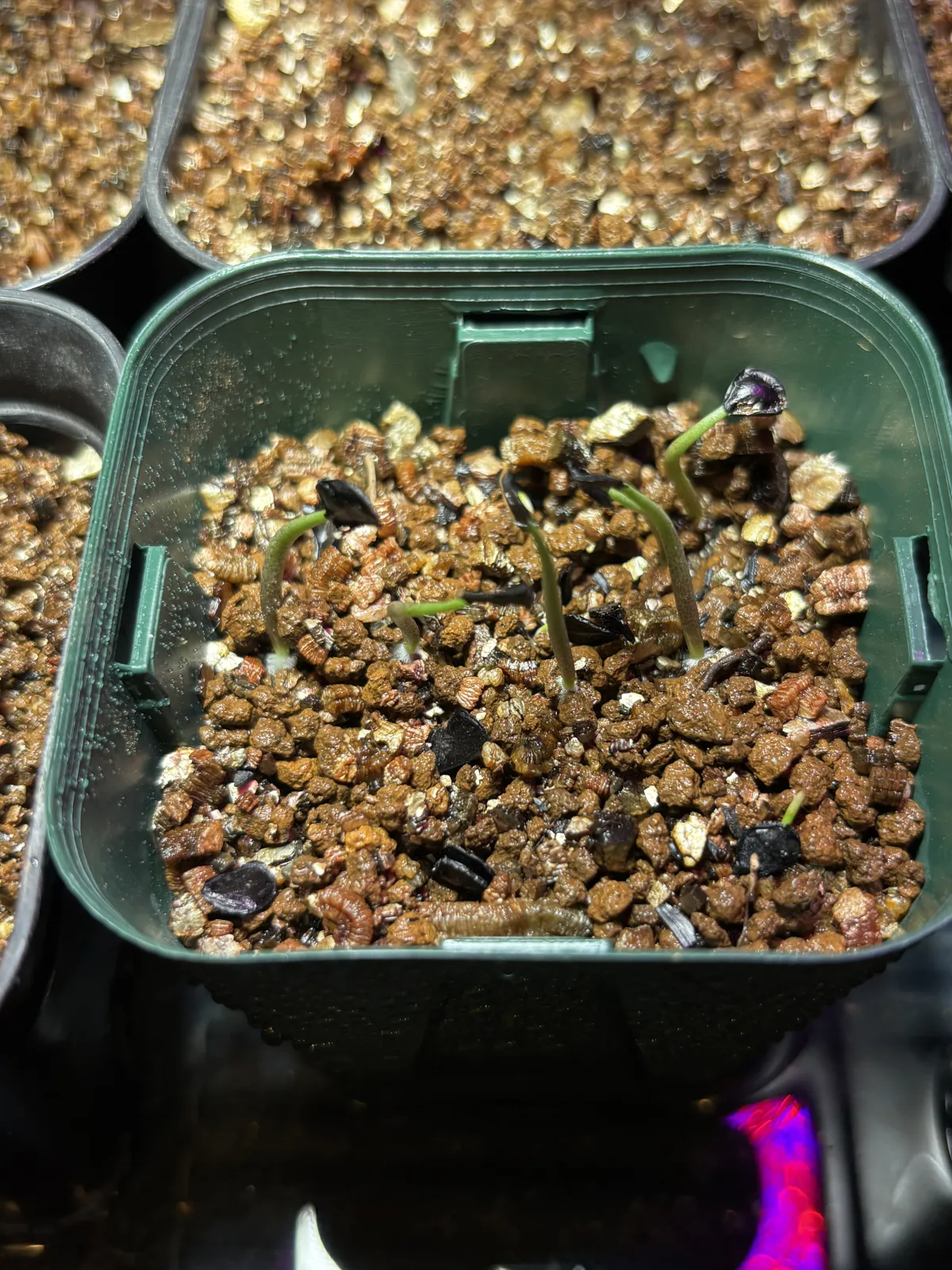 ダコニール+メネデール溶液に1日程度浸漬。細かめの赤玉土とバーミキュライトを半々でまぜだ土を熱湯で殺菌し、土に少し差し込む形で播種。