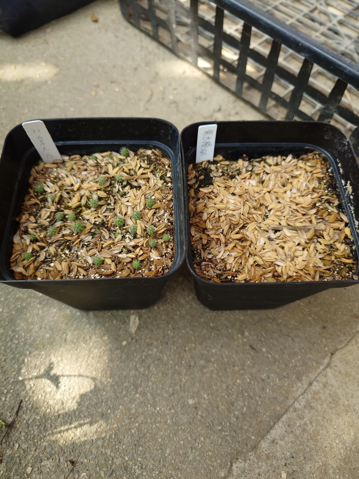 左側の鉢は、全く同環境で播種した他で入手の紫太陽