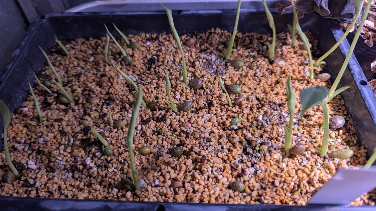 タネまき培養土と真砂土の用土に播種、25度〜30度で乾かない様に管理。3日目には発芽の動きが見てとれました。タネまきから2週間くらいすると芽が出そろう感じかな?