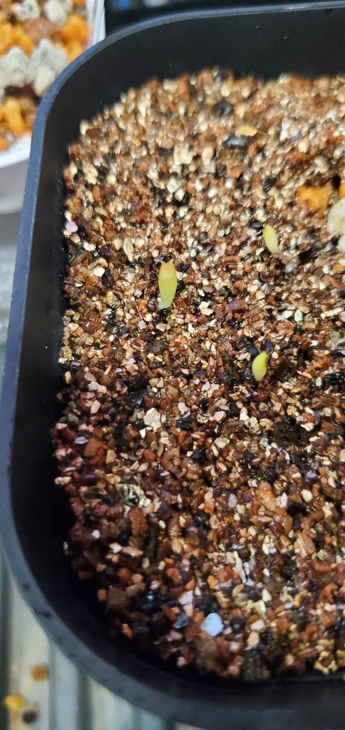 赤玉土×鹿沼土×軽石の上にバーミキュライトを敷き播種、ガラス越し、20度〜25度、腰水と霧吹きで管理