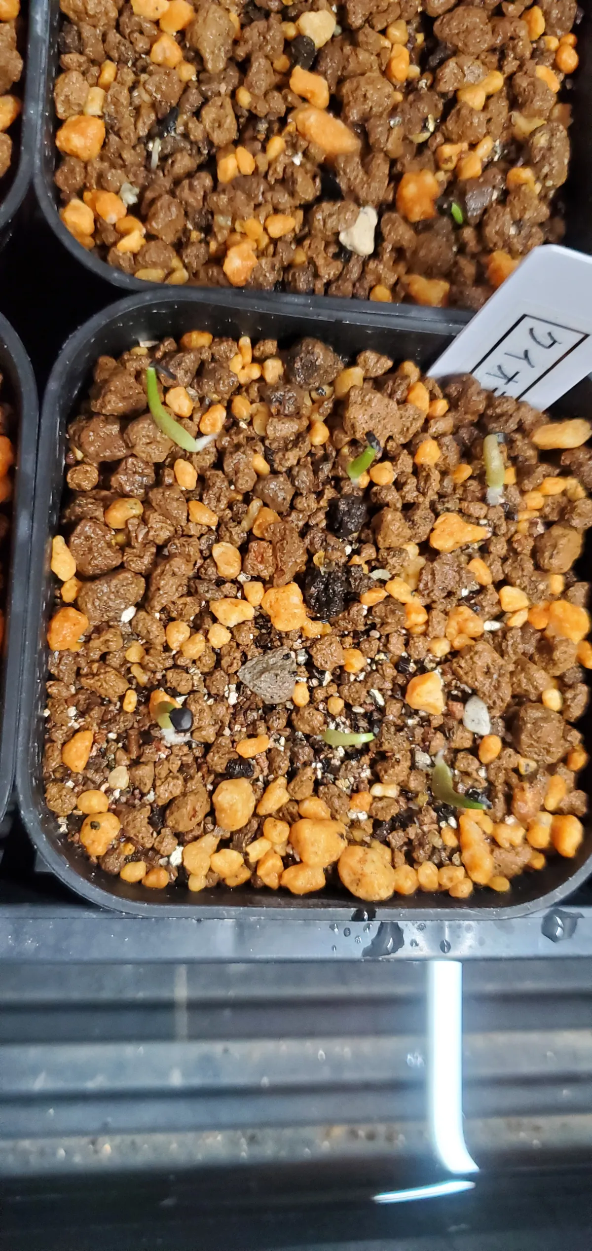 赤玉土3×バーミキュライト2×鹿沼土1に播種、ガラス越し、20度〜25度、腰水と霧吹きで管理
