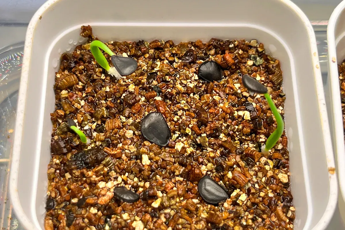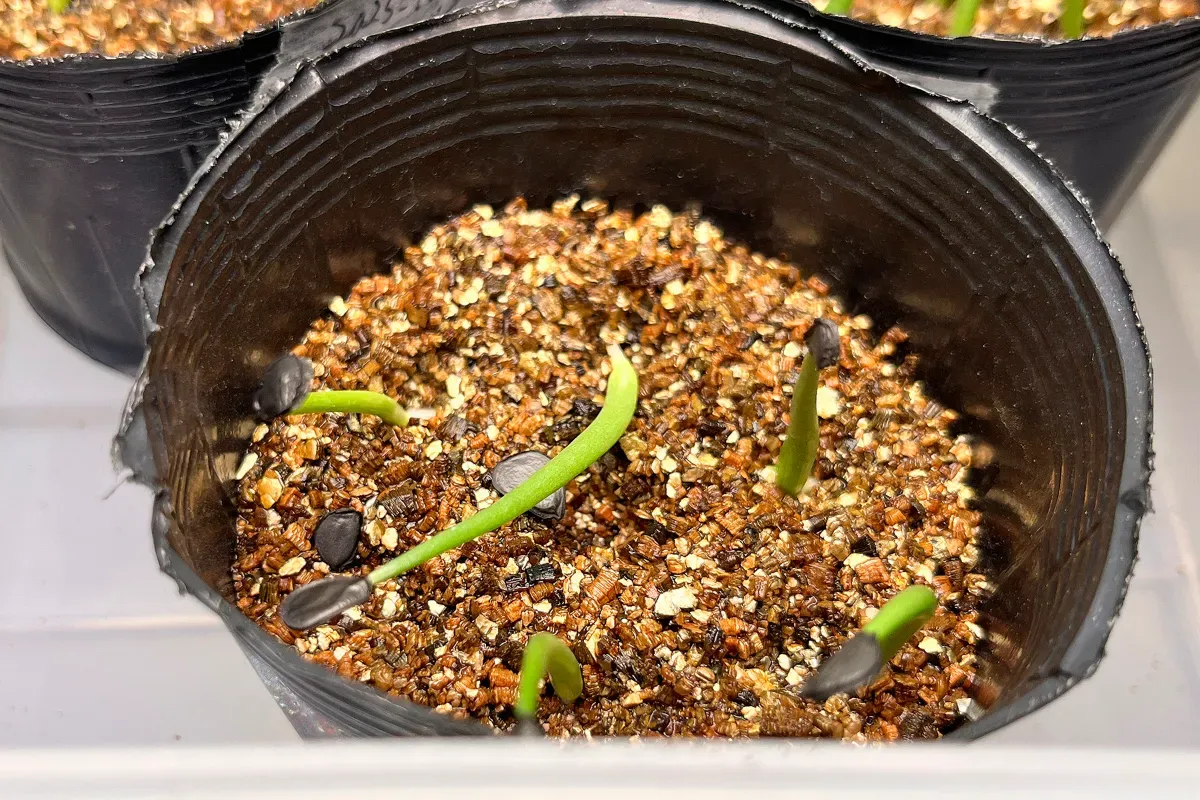 2025/11/09播種 2025/11/28撮影 購入した分を半分づつ2度にわけて播種した最初の7粒のうち、5粒が発芽 播種から3週間、発芽した分は順調に育ってます。