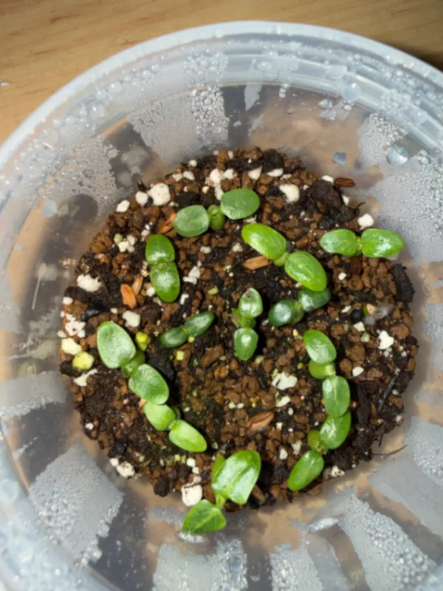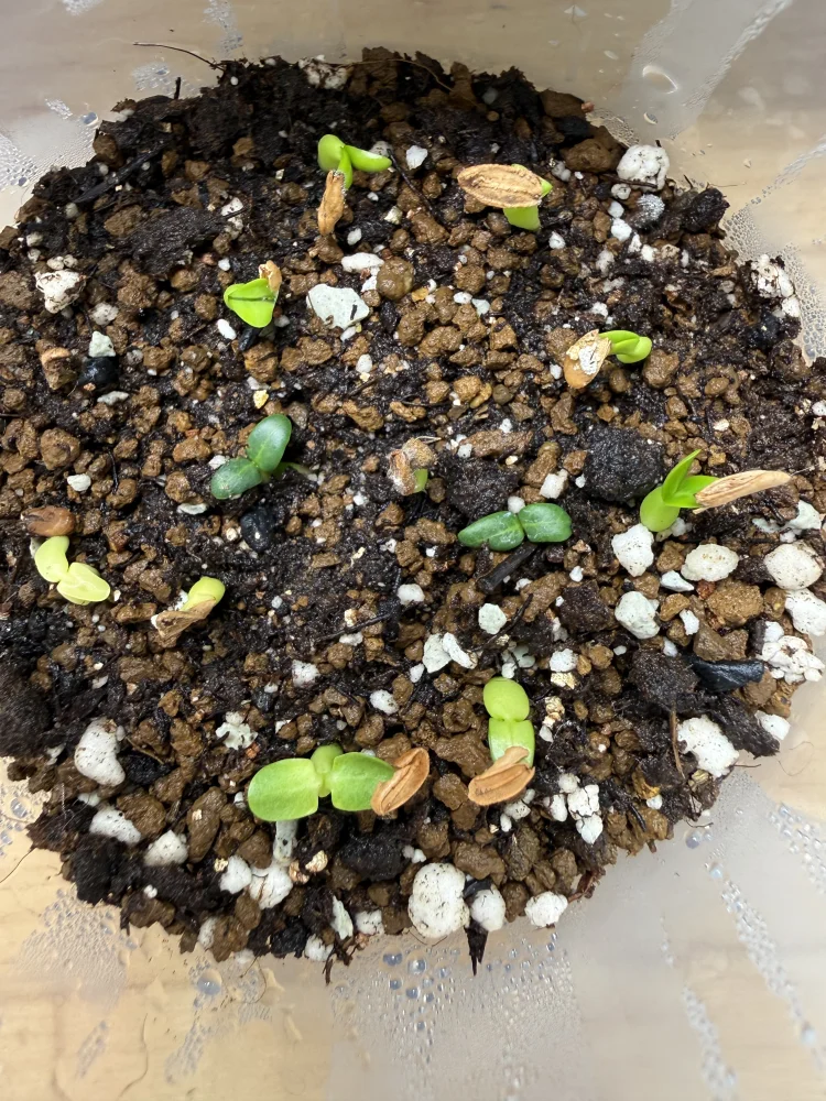 タッパー完全密封、種蒔き用土、ヒーターマット32度 エブレネウム10粒に腐る寸前だったマカイエンセ2粒も元気になってきました。 別でプラステラに植えてあるマカイエンセは小さいままなので、冬の播種は温度と湿度が重要なんだと思いました。