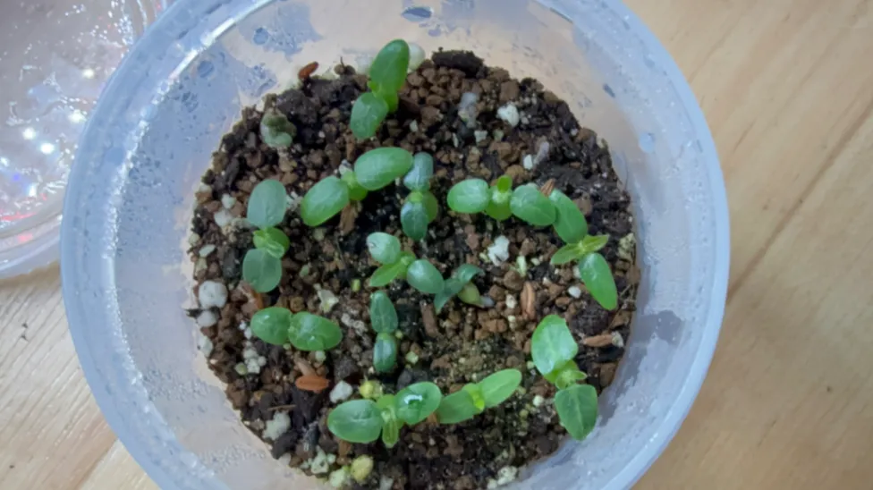 真ん中の双葉はマカイエンセです。発芽後植え替えた所、具合悪くなったのでこちらに植え替えました。根が弱っていたのでダメになるかも。