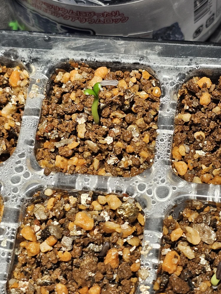 その後は、カビ対策に2日に1回ベンレート1000倍溶液を種と表土にスプレーし腰水をベンレート1000倍溶液に交換。毎日朝と夜の2回湿度を保つ蓋を開け換気したところ残りの種は、カビずに発芽