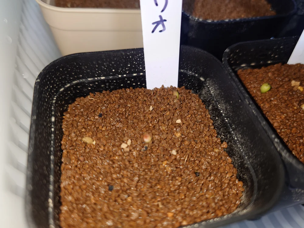 無機細粒混合用土に焼赤玉を蒔き、その上に乗せました。