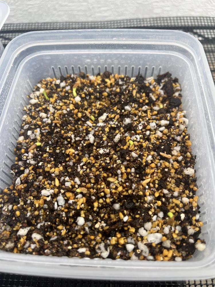 タッパーで市販の用土 メデネールとベントーレートに5時間つけ播種 腰水もそれを使用 初めての播種にしては上出来?笑