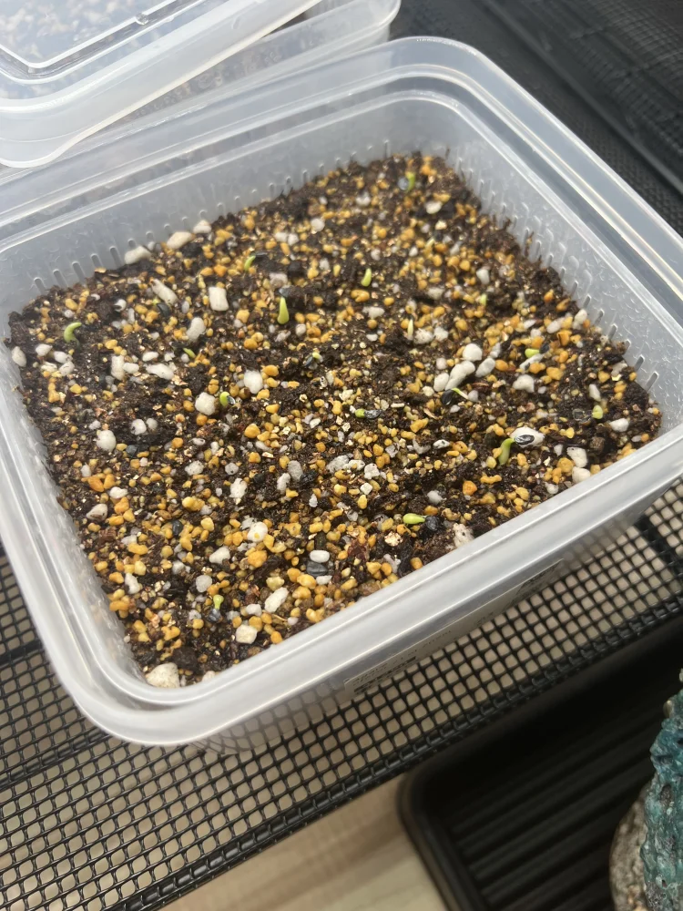 タッパーに市販の用土 メデネール ベントレートに14時間後播種