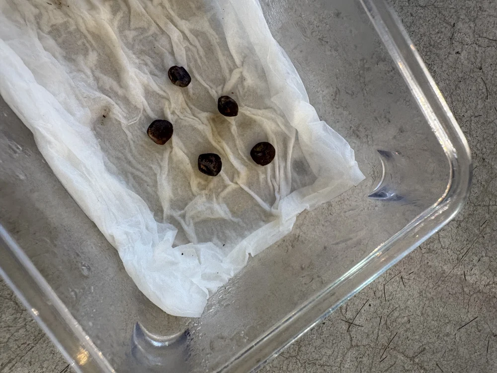 蓋開け後 メネデール ダコニール溶液に1日漬けて、キッチンペーパーの上に密封して播種