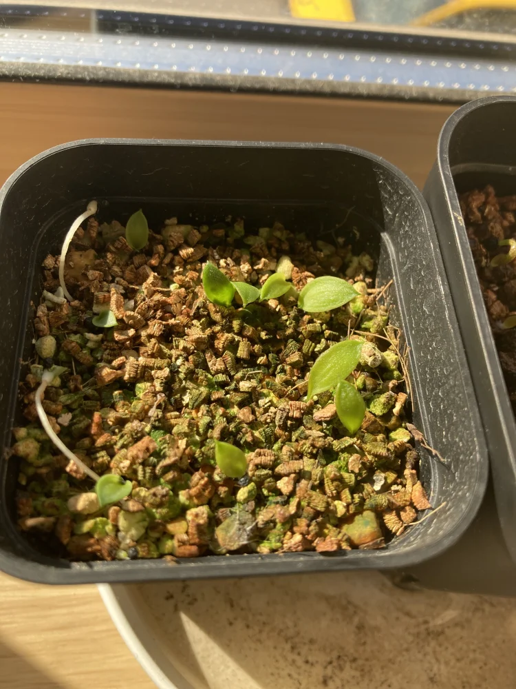 赤玉にバーミキュライトを混ぜ熱湯消毒。冬型なので、冬前に播種しましたが、年明けにようやく発芽。置き場も窓越しやら室内机の上に置いたりと変更しましたが、諦めつつ、室内窓付近で腰水密閉で管理。