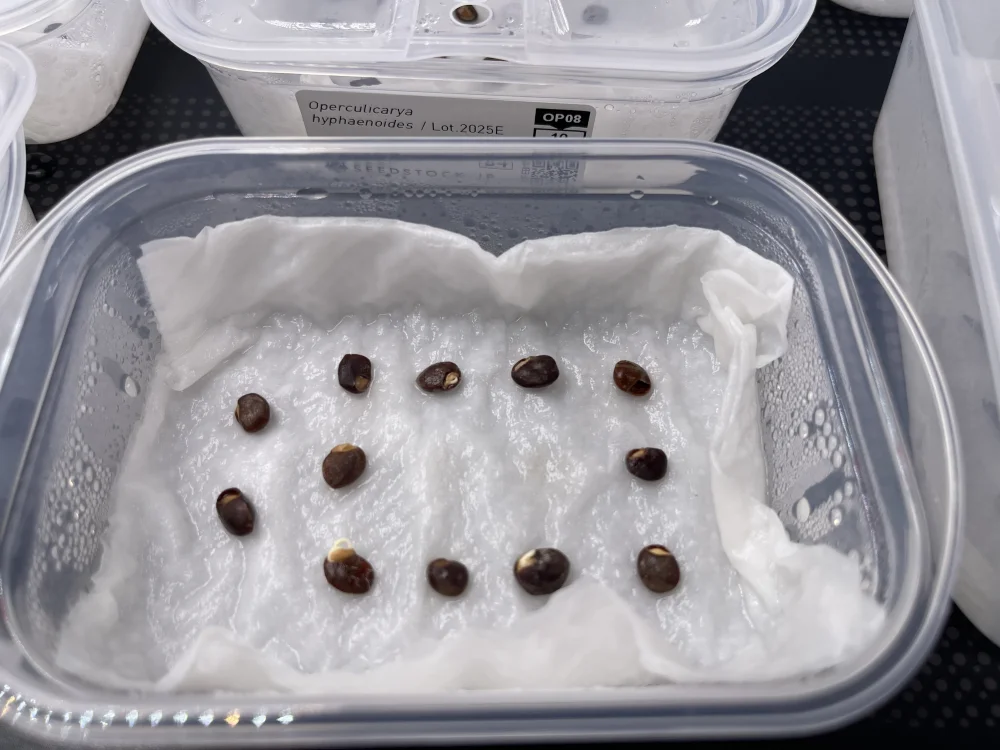 果肉を除去したあとヤスリで全面を削り、蓋開けしてメネデール+ベンレート溶液に20分浸漬後、タッパーにキッチンペーパーを敷いて溶液を染み込ませたのちに播種しました。