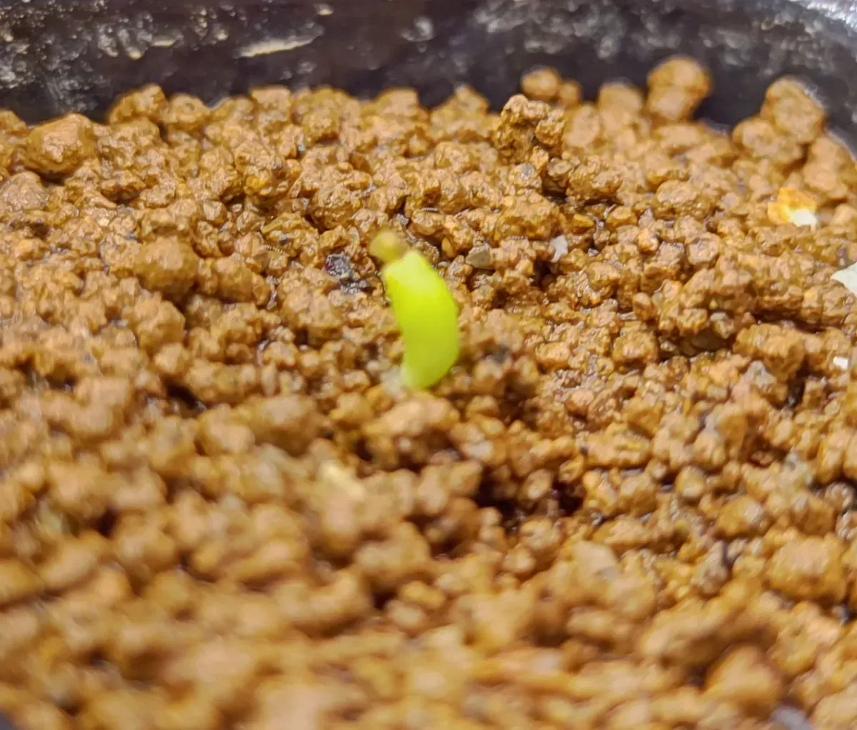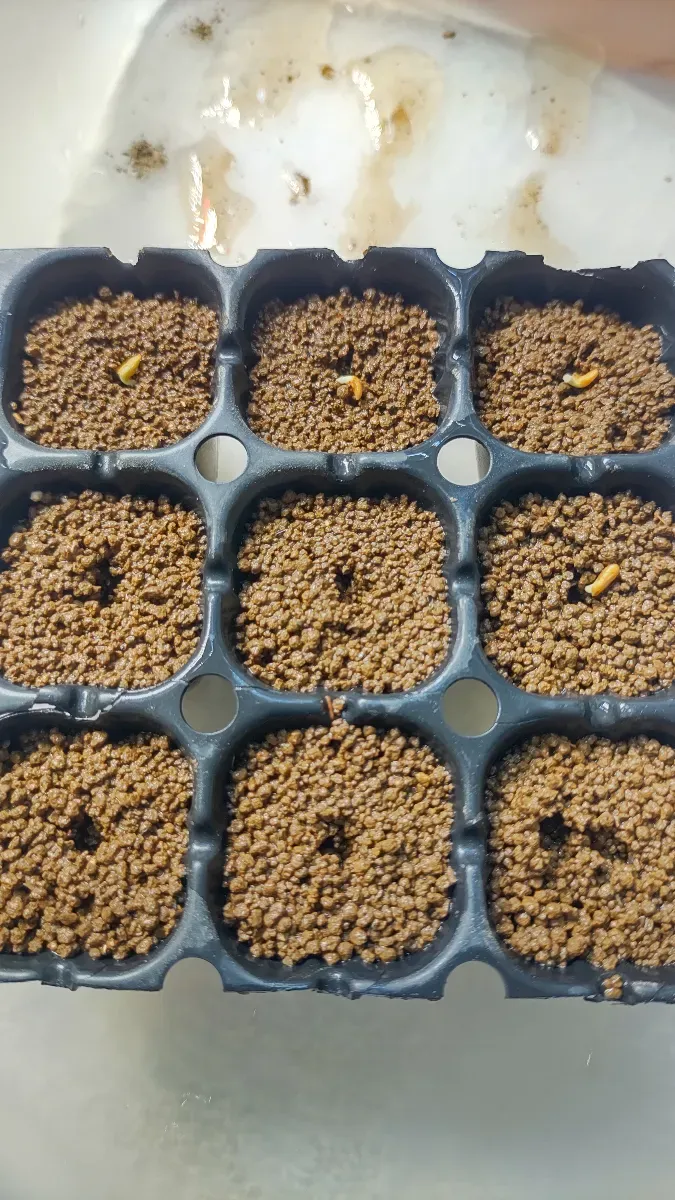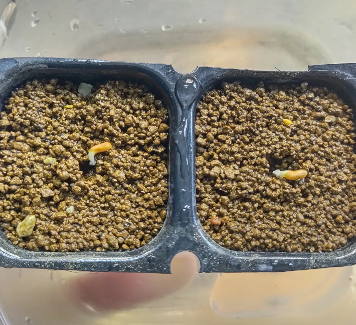 播種4日目で2粒発根。 カビで破棄1粒。 2枚目の写真は3日目に発根した株の翌日。
