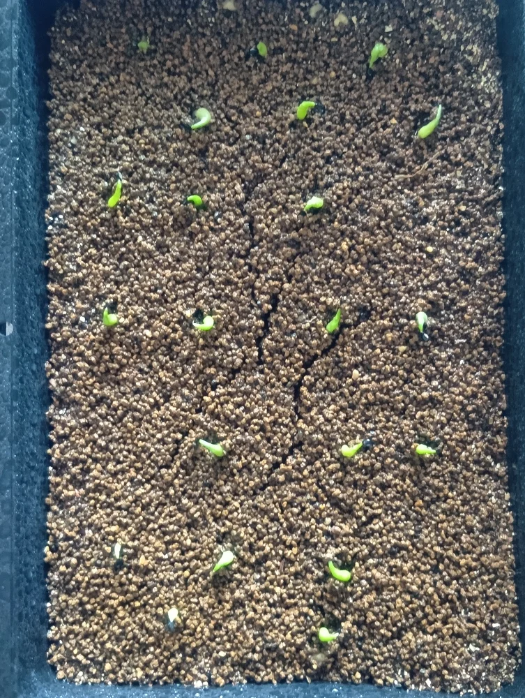 ベンレートで殺菌、熱湯で消毒したバーミキュライト1:1芝の目土に播種、その後篩にかけた芝の目土を覆土し、底面給水にて発芽管理。1回/日ベンレートを噴霧。