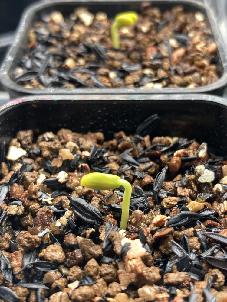 翌日には発根、土に移して今日殻も脱げました。