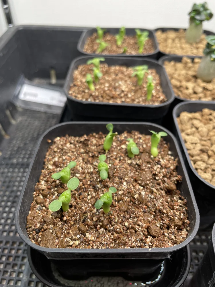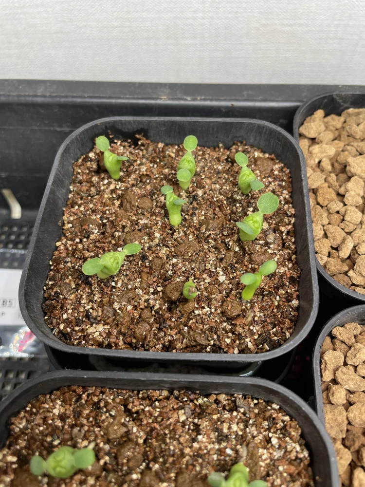 メネデール、ベンレート溶液に12時間。用土は底に軽石、次に赤玉小粒、一番上にバーミキュライトを敷きその上に軽く押し付けるように播種。LEDは20cmくらい離して1日12時間、サーキュレーターで間接的に風をあて、霧吹きは1日5回くらい。腰水管理。それで3日くらいで10粒芽が出たが5日経っても他に動きがなかったため、種の上にバーミキュライトを薄く被せてみたところ11粒がその後に芽を出した。