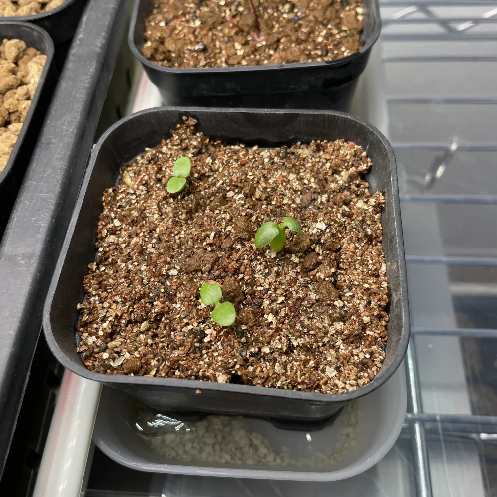メネデール、ベンレート溶液に12時間。用土は底に軽石、次に赤玉小粒、一番上にバーミキュライトを敷きその上に軽く押し付けるように播種。LEDは20cmくらい離して1日12時間、サーキュレーターで間接的に風をあて、霧吹きは1日5回くらい。腰水管理。それで3日くらいで動きが出た。