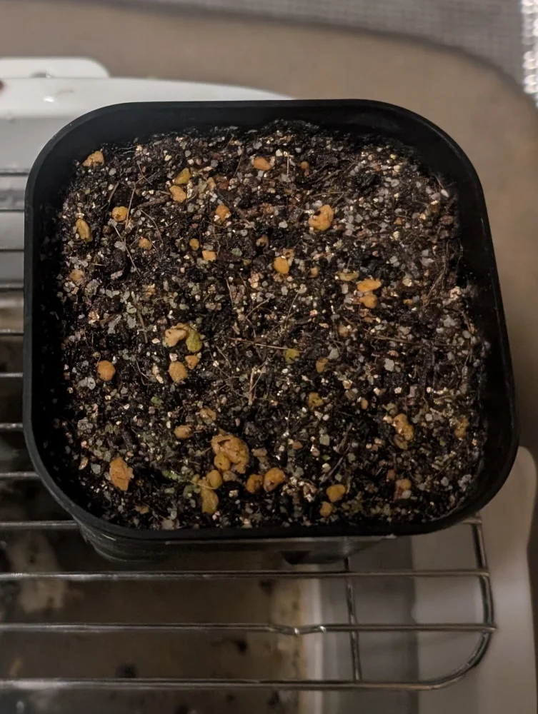 観葉植物の土を9割入れ、種まき用の土表面へ敷き、熱湯消毒後に敷き埋め込む様に播種、ラップをかけ腰水し25度前後で管理