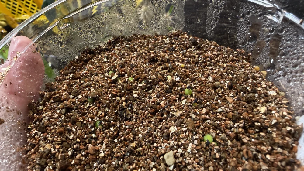 下に赤玉土+鹿沼土+腐葉土、上にバーミキュライトでカップに蓋をして、温室内で管理しています。