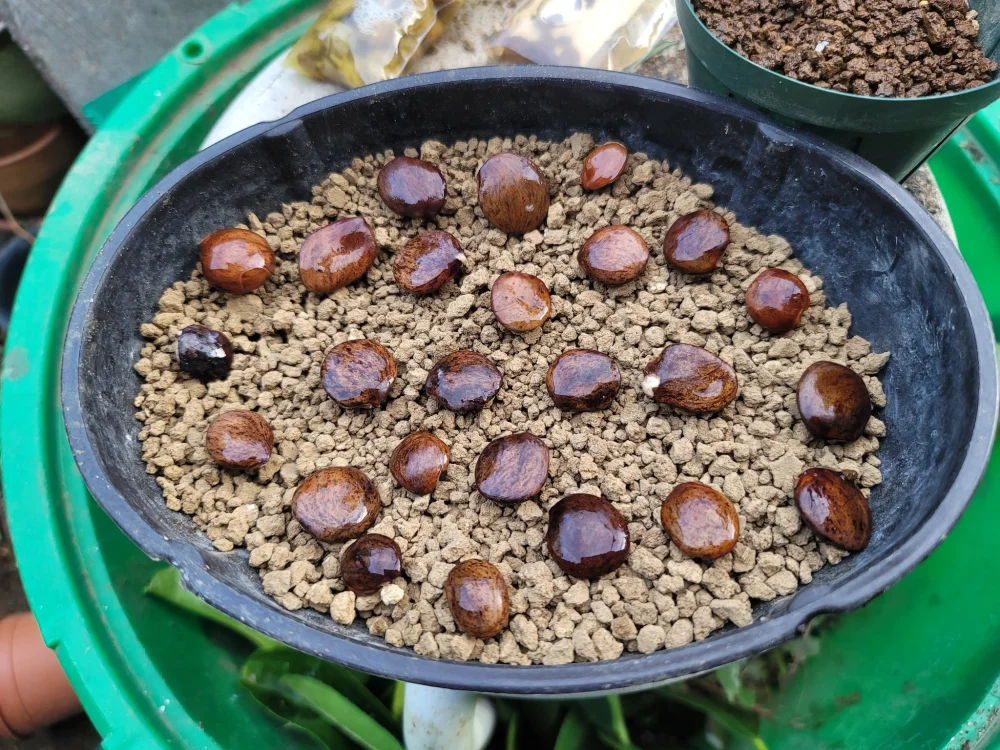 一晩ぬるま湯に浸けたあと赤玉土小粒のみで播種