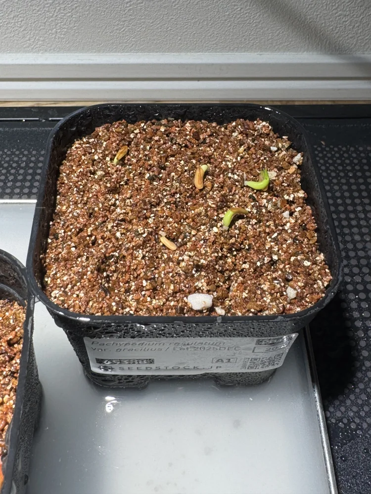 市販のサボテン用の用土、表土にバーミキュライトを敷き用土熱湯消毒後に播種、25度〜30度で管理