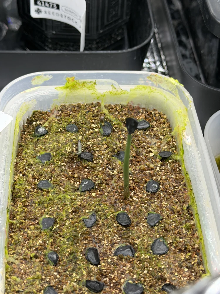 数日経っても変化ないので、カビや腐れを恐れず思い切ってトイレットペーパー被せて湿度100%にで蓋をしたら次の日には3粒だけ発芽、その内の一粒がぐんぐんと成長