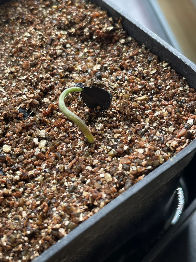 全く動きが見られないため薄く覆土したところ1つだけ発芽しました。