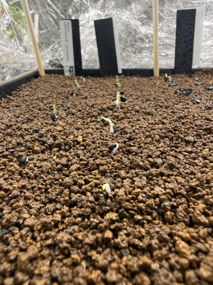 軽石、硬質赤玉、くん炭、ゼオライトの用土の上に赤玉細粒覆土無しにて播種