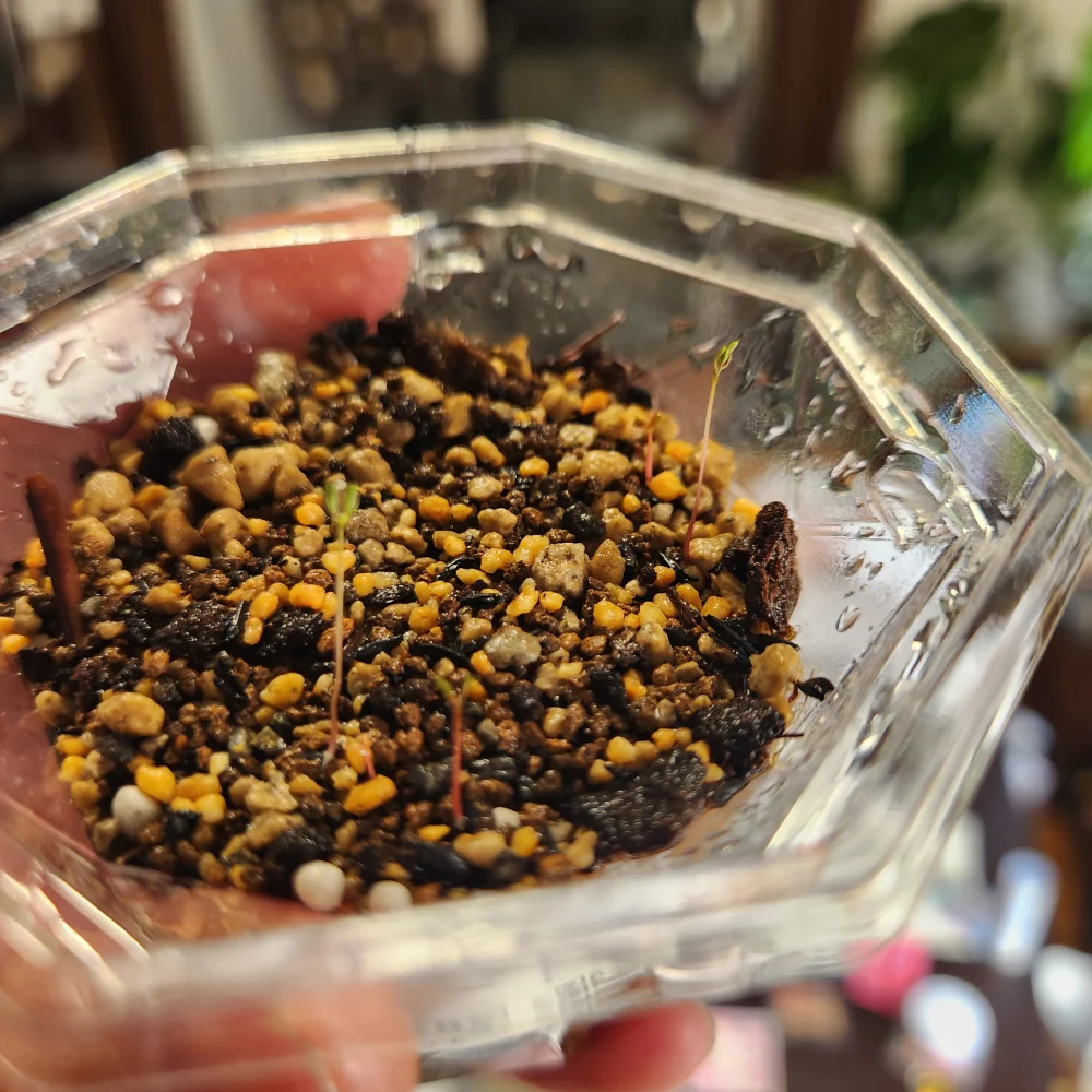 プリンカップに細粒主体のブレンド用土を詰め、竹酢500倍希釈水をカップ半分まで注ぎその上直接からパラパラと播種。