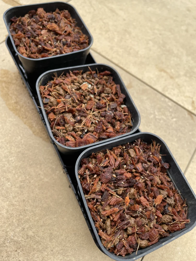 赤玉土、ベラボン、ゼオライト、バーミキュライトの用土に蓋を開けた種子を埋まりきらないように播種。
