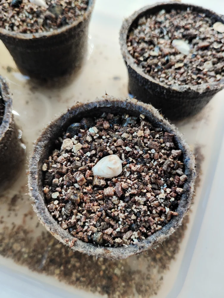 ジフィーポットにバーミキュライト使用。メネデールとダコニール溶液に一晩浸漬。