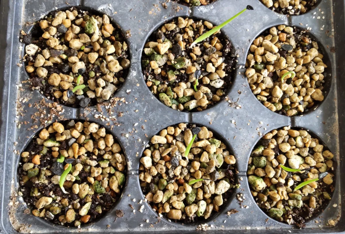2週間後 現在12株発芽しています。12/14粒の発芽率86%ぐらいですかね。