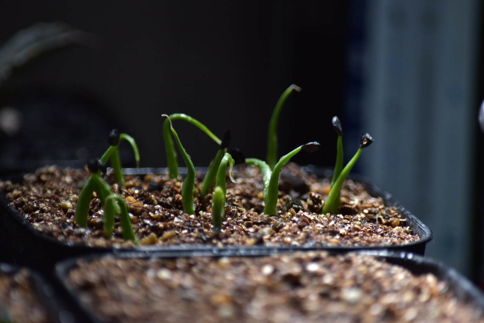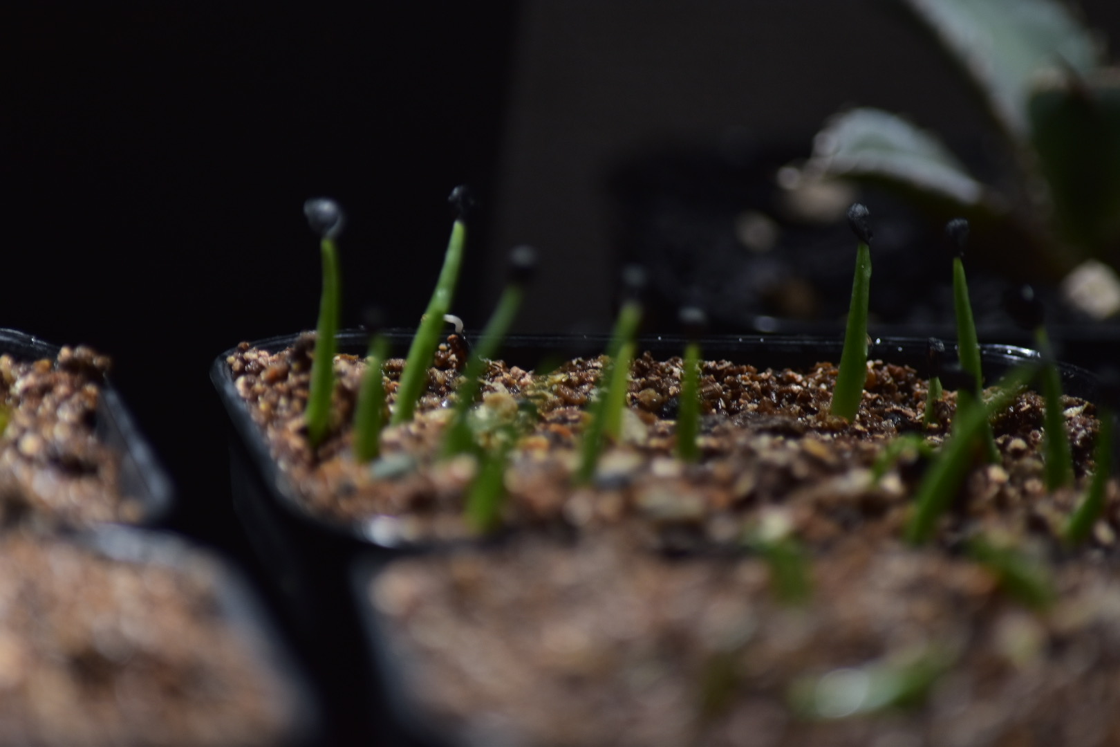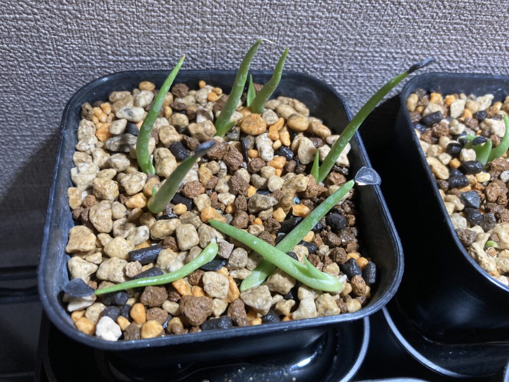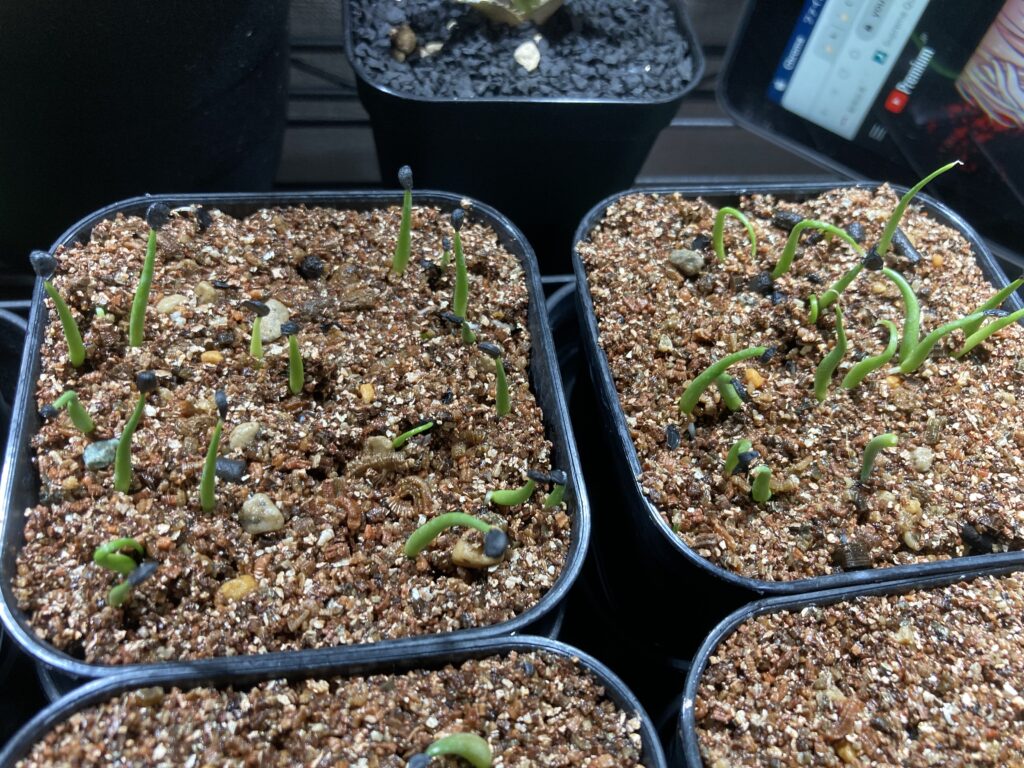 プレステラ90に多肉用土使用。熱湯消毒後、冷ましてから播種。ベンレートを薄めた水で腰水管理、1日数回ベンレート霧吹き。5日ほどで発芽。発芽率は90%程。