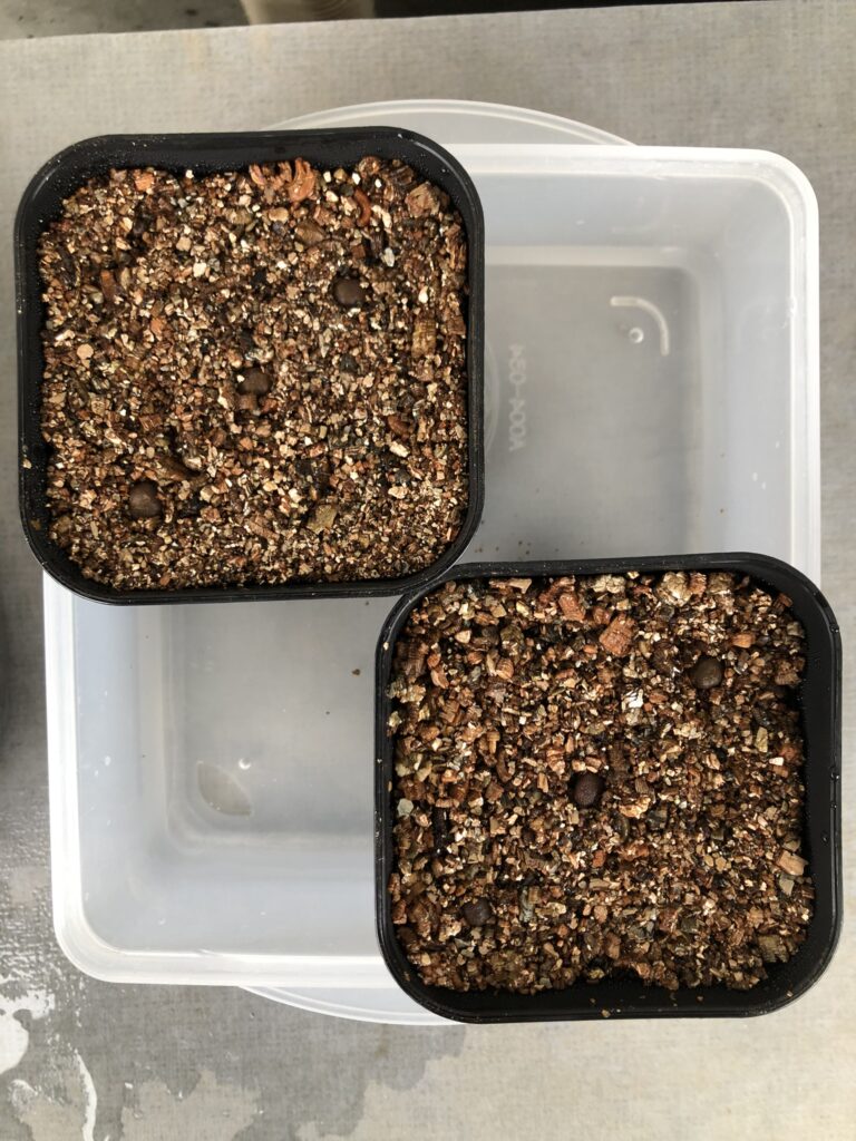 用土は日向土、赤土(極小粒)、バーミキュライト。ベンレート500倍希釈した水に12時間つけたのち播種。