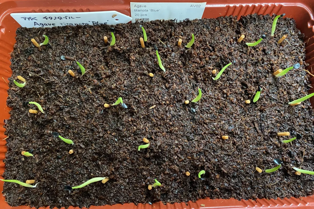 用土はピートバン。容器は弁当折箱、発芽するまで蓋をしていた。
