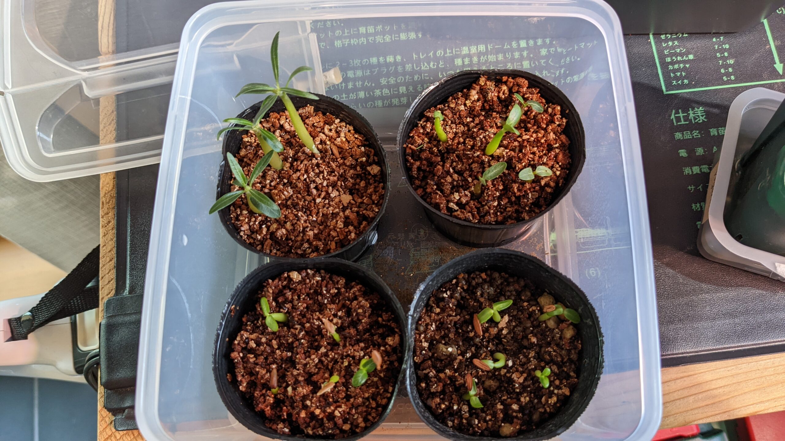 室温30℃前後、湿度60%程度の環境で、タッパーの蓋をした状態で播種したが、動きが見られなかったので蓋を開ける。その後は霧吹きをこまめに行う。
