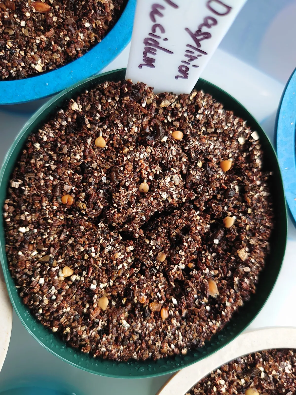 モニター用に頂いたルキダム、水(メネデール、ダコニール入り)に12時間程つけおいて、8/28早朝播種。腰水にて、たまに霧吹きをして5日目に白い線状の芽を確認しました。
