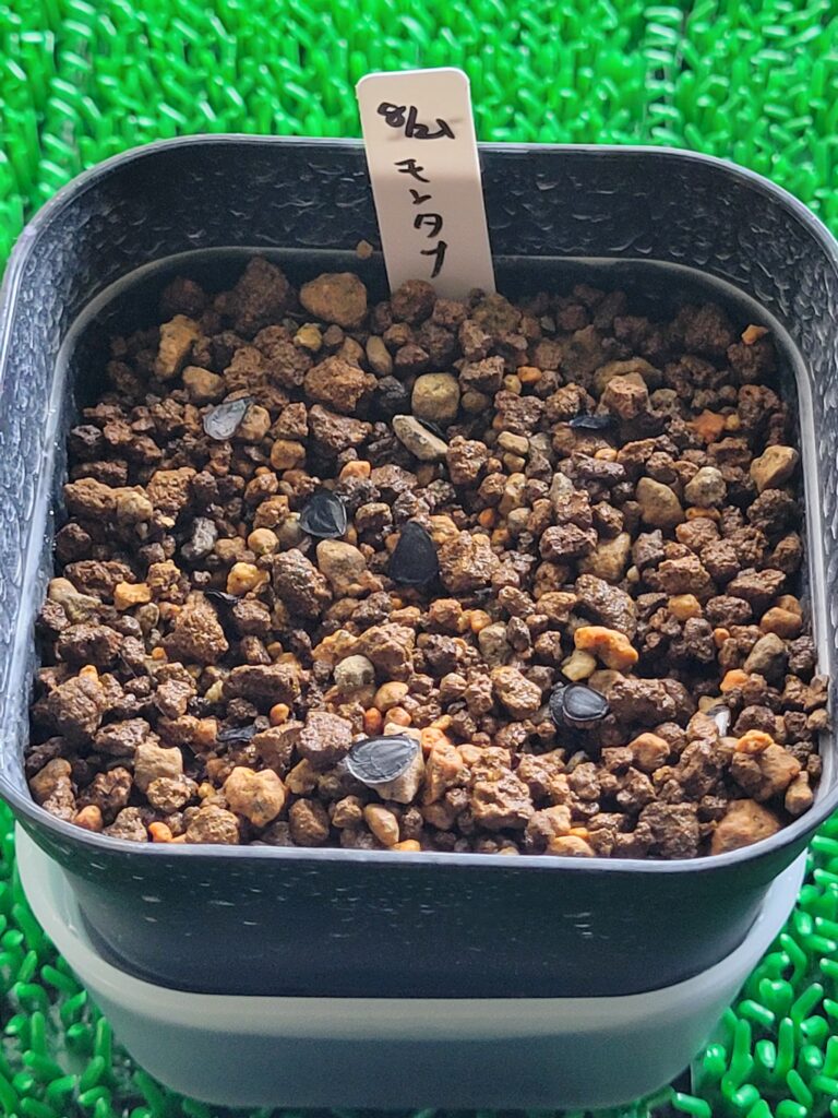 種が到着後24時間近くベンレート水和剤に浸水し、赤玉土と桐生砂の小粒を混ぜた用土の上に蒔きました。