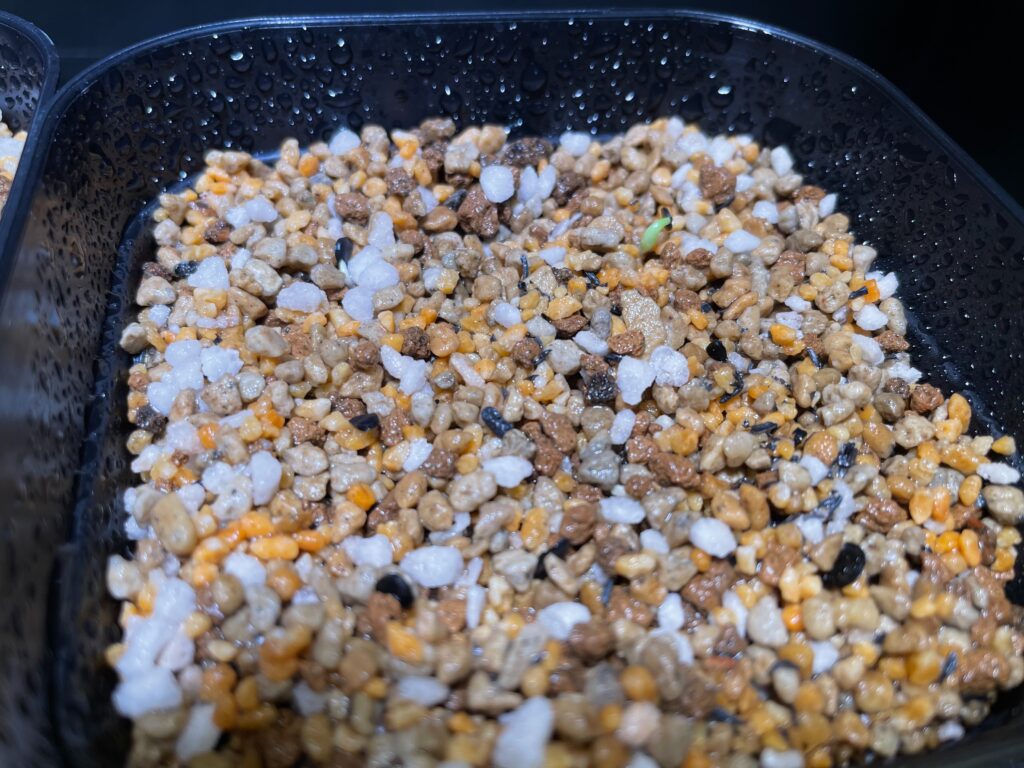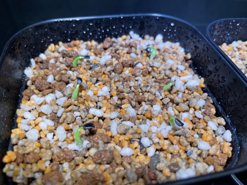 この8粒はすべて、準備で真水に2日つけていた段階で根っこが覗いていたので、後の4粒はしばらく様子見。